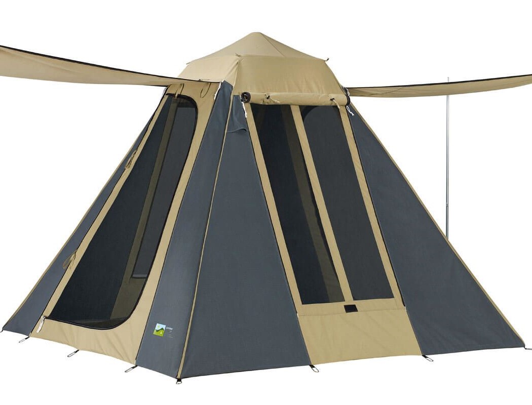 Tarp shelter with guy ropes, pegs, poles and hammer